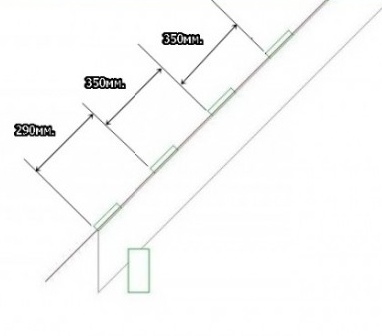 Шаг от первой доски до второй всегда должен бить меньше чем ширина волны (самая распространённая ширина волна 350мм.) так ка нам придётся делать выпуск кровельного листа.