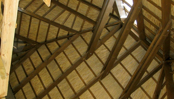 Покрытие укладывают на обрешетку отдельными снопами, надежно их фиксируя с помощью стальных стержней. Далее со сдвигом укладывается следующий ряд. Плотная укладка позволяет снизить риск возгорания и пожара. При этом дополнительное утепление не требуется.
