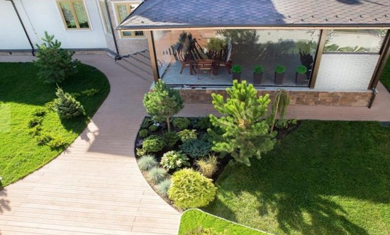 Ну, а в случае если ваш сад имеет неровный ландшафт или он расположен на склоне. То отличным материалам может стать композитная или древесная террасная доска. Подобное решение, отлично подходит для всех видов открытых пространств: для сада, террасы, балкона. Террасная доска добавляет характер к пространству. Поднимаясь над цветочными клумбами, она четко подчеркивает красивую зелень, одновременно обеспечивая комфорт.