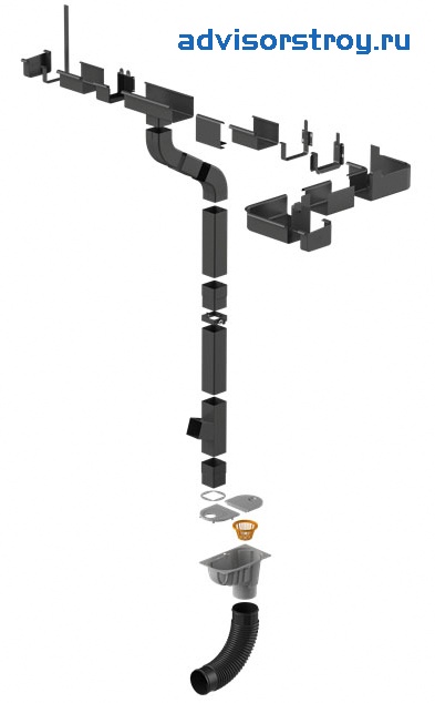 - Низкая цена. Водосток из ПВХ стоит почти вдвое меньше, чем аналог из металла.