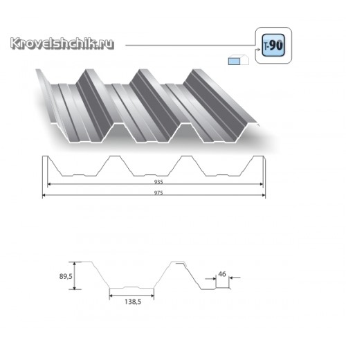 Профнастил T90 применим для перекрытия крыш крупный производственных и общественных объектов. Толщина профлиста как правило составляет от 0.5-1мм. Может быть дополнительно вскрыт полимерным защитным слоем. Характерна разнообразная цветовая RAl палитра.