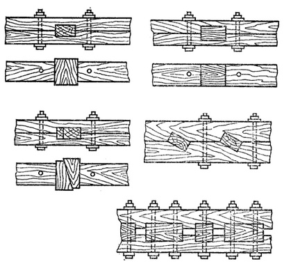 Широкое распространение в инженерных сооружениях из дерева получило сопряжение при помощи специального вкладыша шпонки. Шпонки могут быть деревянными и металлическими и разлучатся по форме.