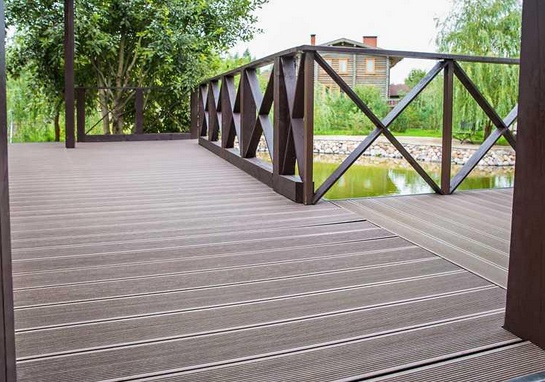 Зачастую террасы обустраиваются на открытом пространстве, поэтому подвергаются всевозможным внешним воздействиям (повышенной влажности, солнечному излучению, намоканию и пр.), что пагубно отражается на виде и свойствах покрытия. Поэтому более подходящим вариантом станет доска не из древесины, а из композитных материалов, которая устойчива к влиянию внешних факторов и характеризуется долговечностью, красивым оформлением. Террасная доска такого типа может использоваться для пола беседок, садовых дорожек, балконов, бассейнов, набережных и прочих пространств.