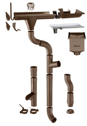 Приобретая водосток, мы контролируем наличие всех комплектующих и крепежа. Согласно планируемой задаче, проверяем соответствие труб и желобов. В комплект обычно входит: