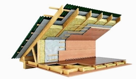 Теплоизоляция. Проводится для сохранения тепла в подкровельном пространстве. Утеплитель должен иметь не только высокие теплоизолирующие свойства, но и быть негорючим, устойчивым к влаге и различным повреждениям, экологически чистым. Он может быть рулонным, плиточным или насыпным.